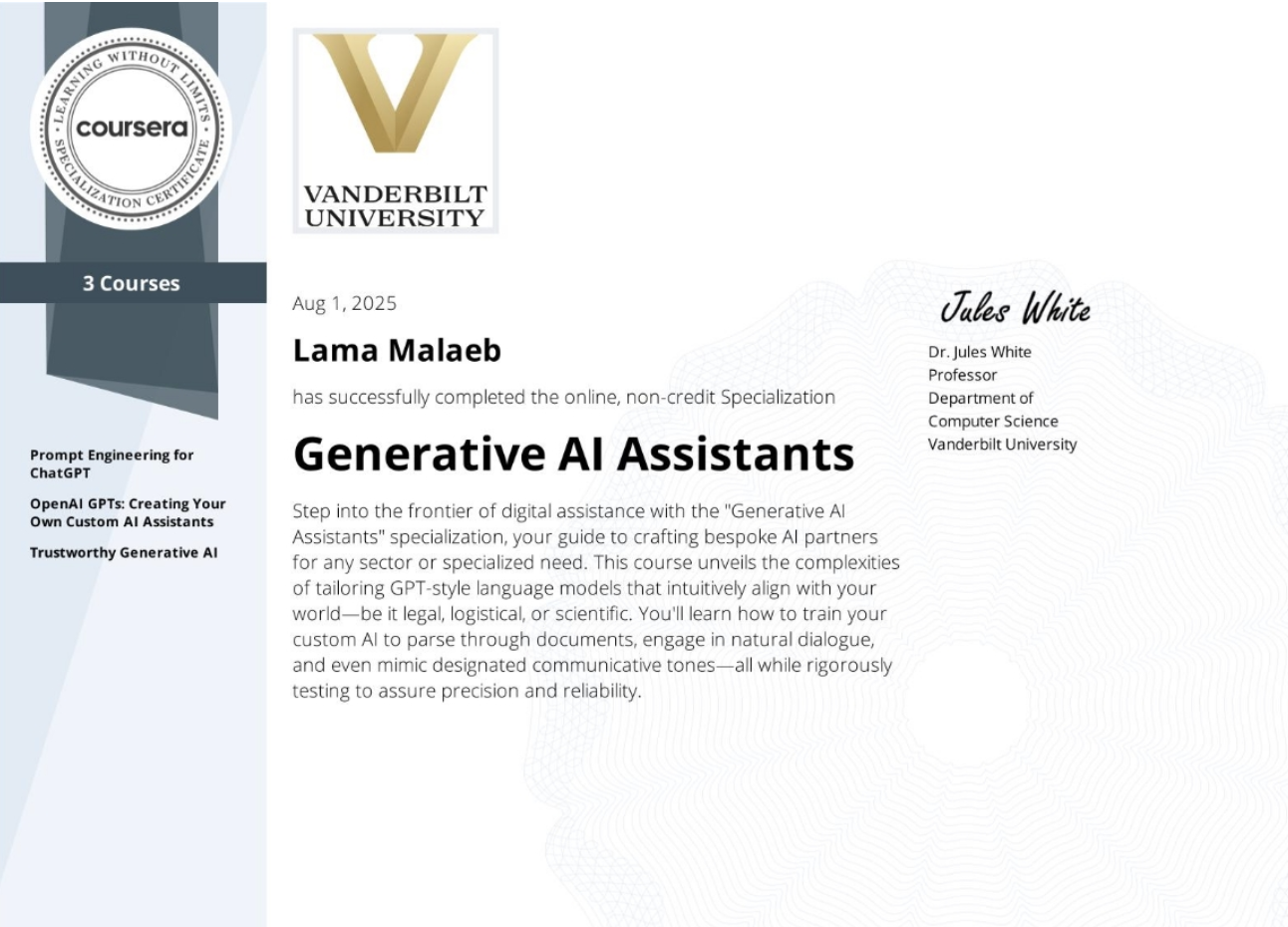 4 Vanderbilt University Certifications Generative AI Assistants Specialization